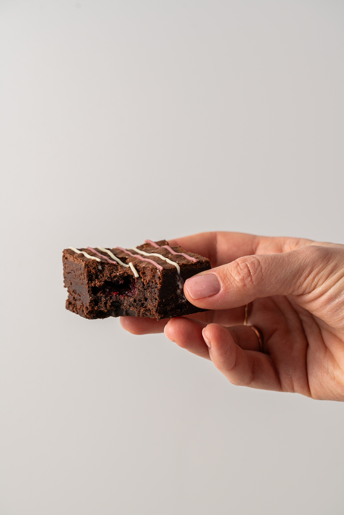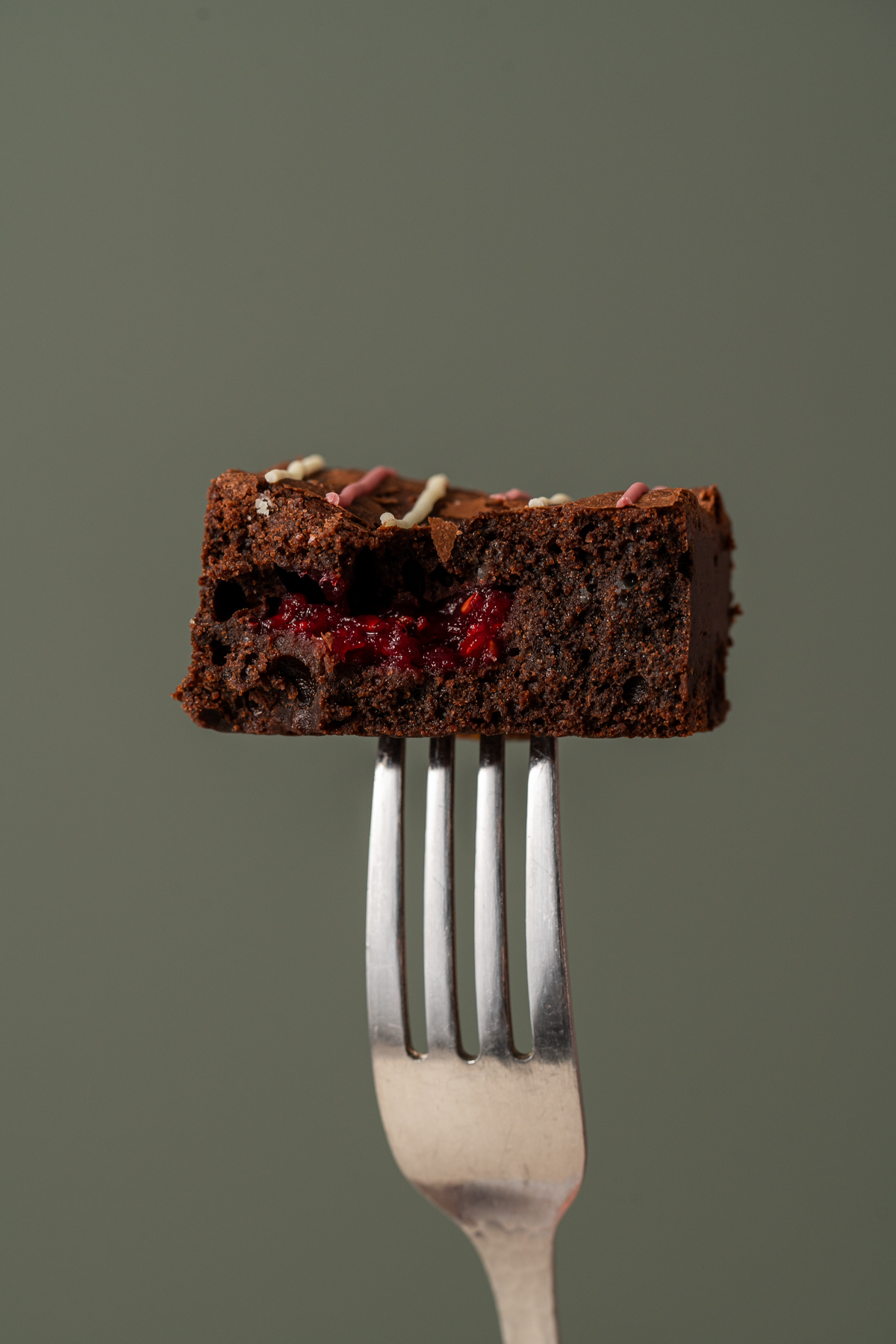 Brownie de ciocolată neagră cu umplutură de zmeură dulce-acrișoară