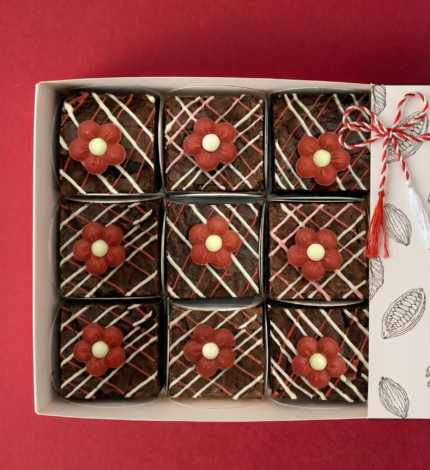 Brownies cu ciocolată albă fină și ciocolată neagră intensă, decorate manual cu floricele din ciocolată și ambalate individual, gata de oferit.